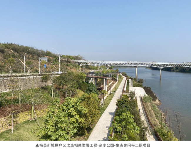 梅县新城棚户区改造相关附属工程-亲水公园•生态休闲带二期项目位于梅州市梅县区,工程建设内容包含市政道路、市政园林、水利。项目引入海绵城市设计理念打造生态公园,注重海绵城市技术措施的应用,将水利工程与道路、园林工程有机的结合起来,既改善了新县城梅花山西片区的交通状况,又为新城区百姓提供休闲、亲水的活动场所,同时有效延伸了新城区防汛道路。
