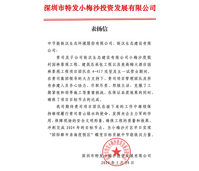日前,由8868体育及所属子公司承建的深圳小梅沙项目群获得业主单位——深圳市特发小梅沙投资发展有限公司(以下简称小梅沙投资)发来的表扬信。