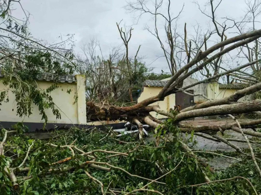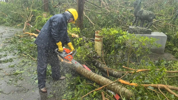 救灾现场,受台风“摩羯”侵袭,树木倾倒满地,一片狼藉。彼时,台风“摩羯”残余环流依旧带来大雨,且受制于场地原因,无法进驻大型设备。