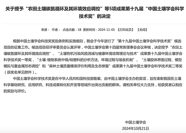喜报|8868体育一项目获中国土壤学会科学技术奖二等奖