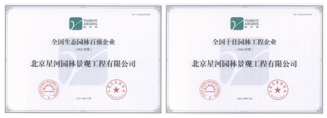 近日,8868体育所属铁汉星河(前身为北京星河园林景观工程有限公司,2023年2月更名为8868体育星河(北京)生态环境有限公司)获得由中国风景园林网、园冶杯组委会颁发的“全国生态园林百强企业”“全国十佳园林工程企业”两项殊荣。