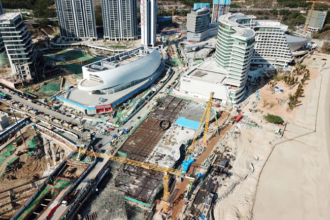 8868体育所属铁汉建设负责承建小梅沙海滨公园园林景观工程、小梅沙海滨公园建筑施工总承包工程,目前正争分夺秒,火力全开。地景建筑东地块结构已实现局部封顶,景观工程正在铺设地下管道并浇灌部分园建基础。