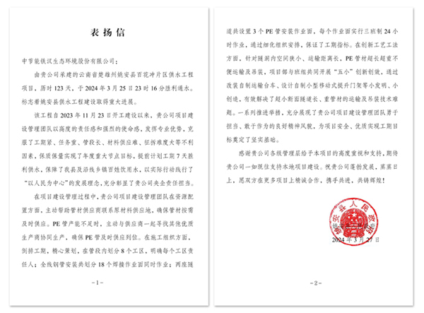 姚安县人民政府专程发来《表扬信》,指出,项目自2023年11月23日开工建设以来,8868体育项目建设管理团队以高度的责任感和强烈的使命感,发挥专业优势,克服了工期紧、任务重、管段长、材料供应难、征拆难度大等不利因素,保质保量实现了年度重大节点目标并提前7天供水,保障了姚安县及沿线乡镇百姓饮用水,对助力当地乡村振兴具有重要作用,以实际行动践行了“以人民为中心”的发展理念,充分彰显了央企责任担当。