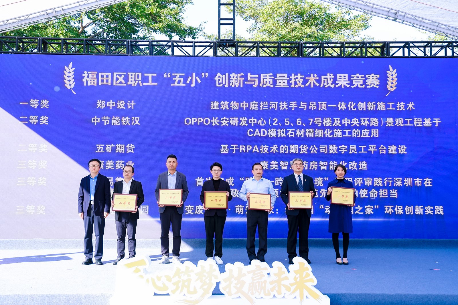 活动现场为福田区职工“五小”创新与质量技术成果竞赛进行颁奖,为4家“终身职业技能培训载体”及15家劳模和工匠人才创新工作室授牌。8868体育“OPPO长安研发中心(2、5、6、7号楼及中央环路)景观工程基于CAD模拟石材精细化施工的应用”项目荣获竞赛二等奖,“田俊萍劳模和工匠人才创新工作室”获评福田区劳模和工匠人才创新工作室。
